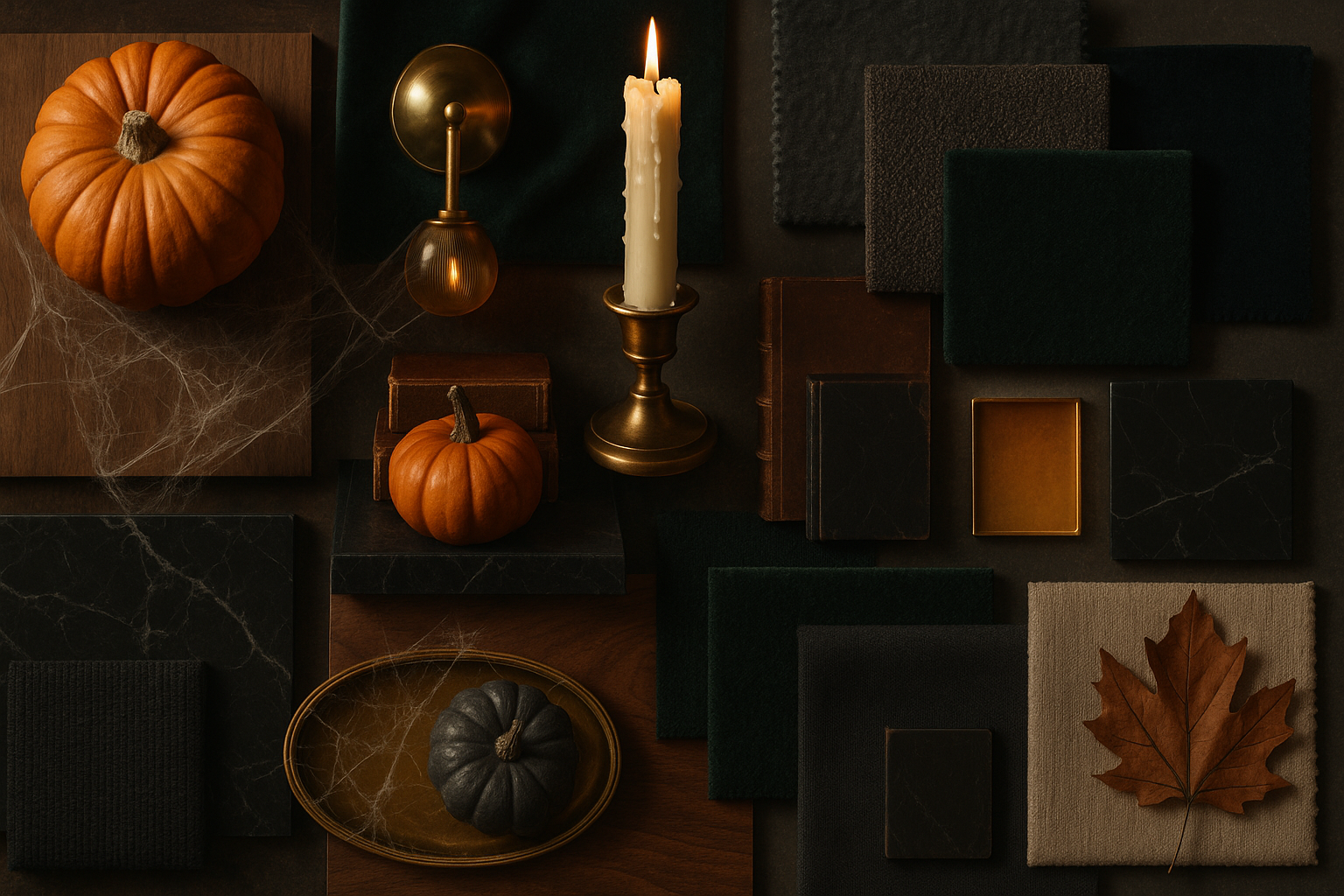 Textural Depth: Halloween atmosphere isn't about what you add—it's about layering. Render spaces with mixed textures: a chunky knit throw over smooth leather, rough timber against polished marble, matte black hardware on glossy cabinetry. Depth creates intrigue.