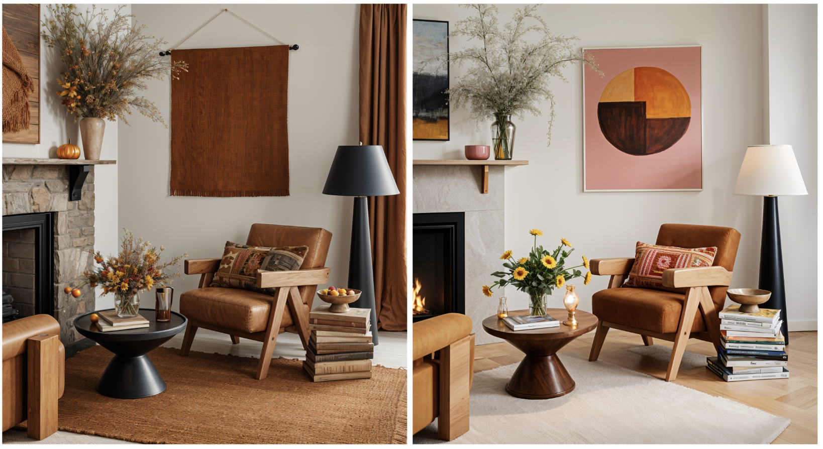 Ground Spaces with Organic Materials: Virtually stage with materials that feel authentically autumnal—wide-plank hardwood floors, stone fireplace surrounds, furniture in walnut or oak. Use AI tools to test how these foundational elements interact with softer seasonal touches like dried eucalyptus arrangements, woven baskets, or ceramic vessels in earth tones.