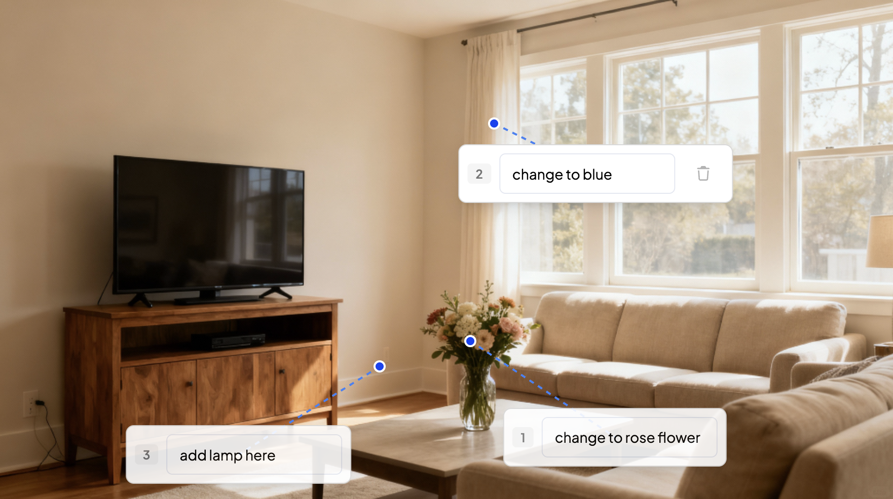 - Point at the specific element you want to change — a sofa, a wall texture, a light fixture.
