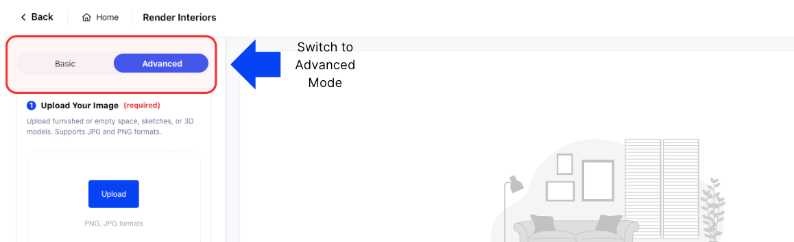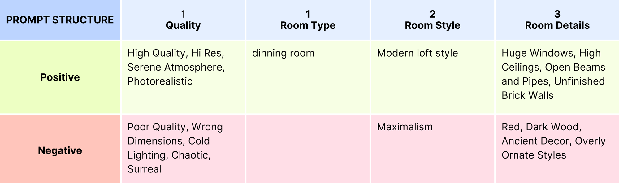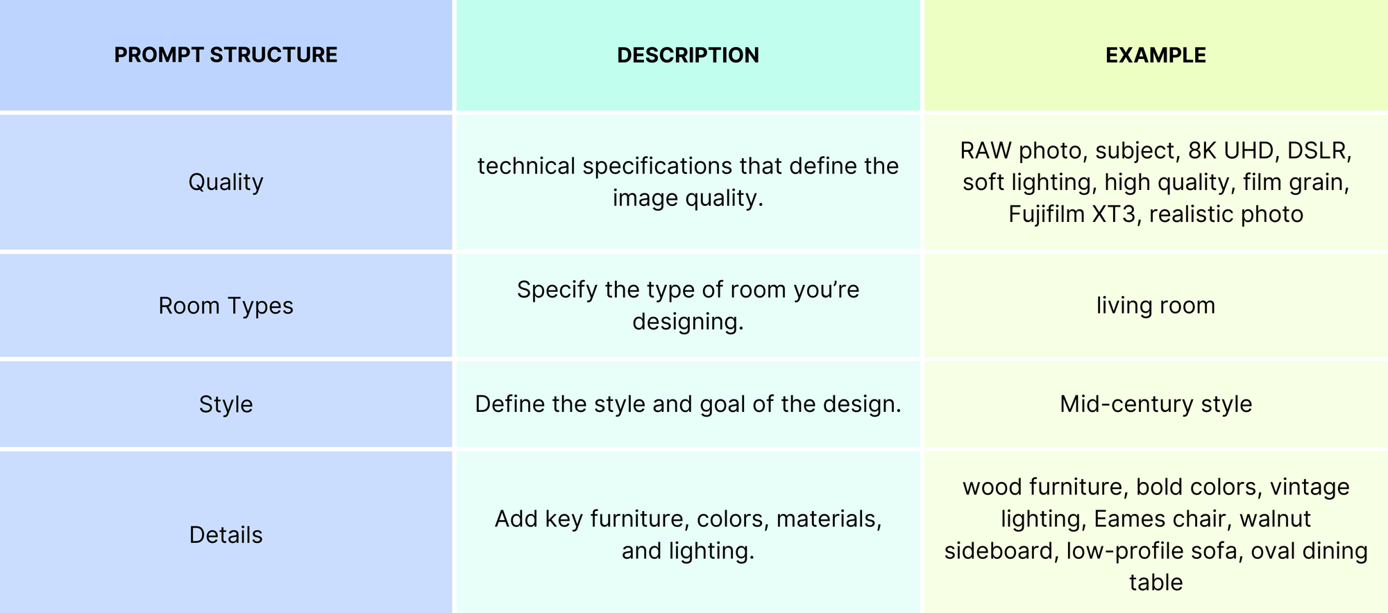 In advanced mode, prompts can be further broken down into quality, room type, style, and details. Use these techniques to create highly tailored designs that match your vision exactly.