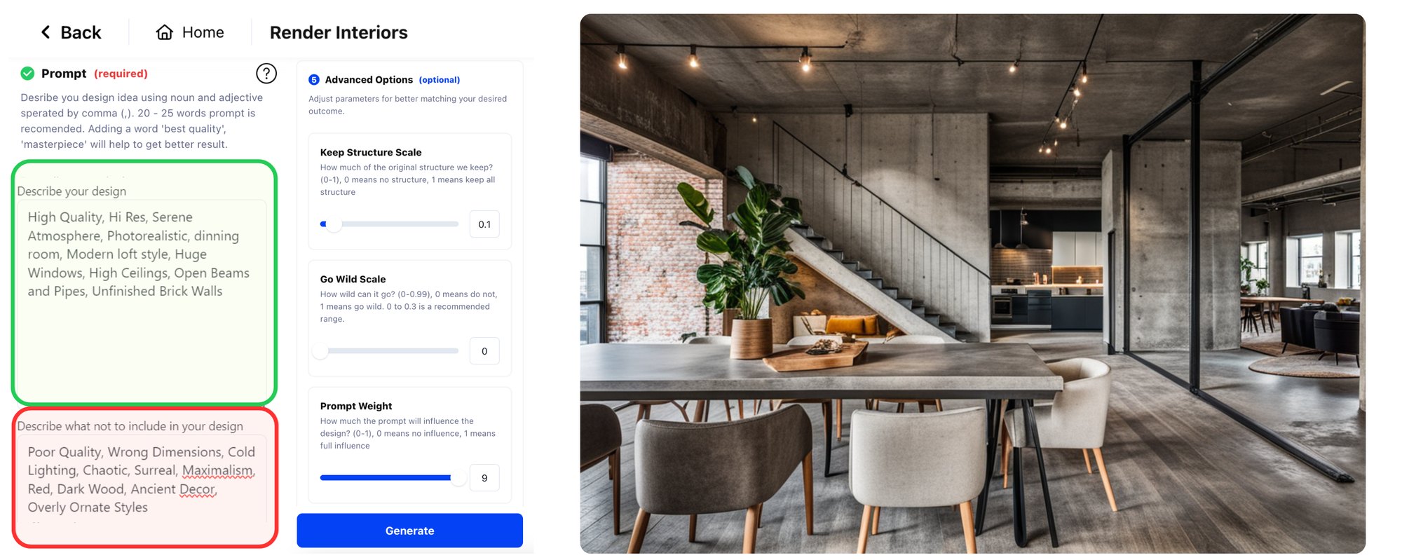 In Spacely AI, understanding how to balance positive and negative prompts is essential for advanced mode. This function is particularly useful when using Render Interiors, Render Exteriors, Furnish Empty Space, and Style Transfer.