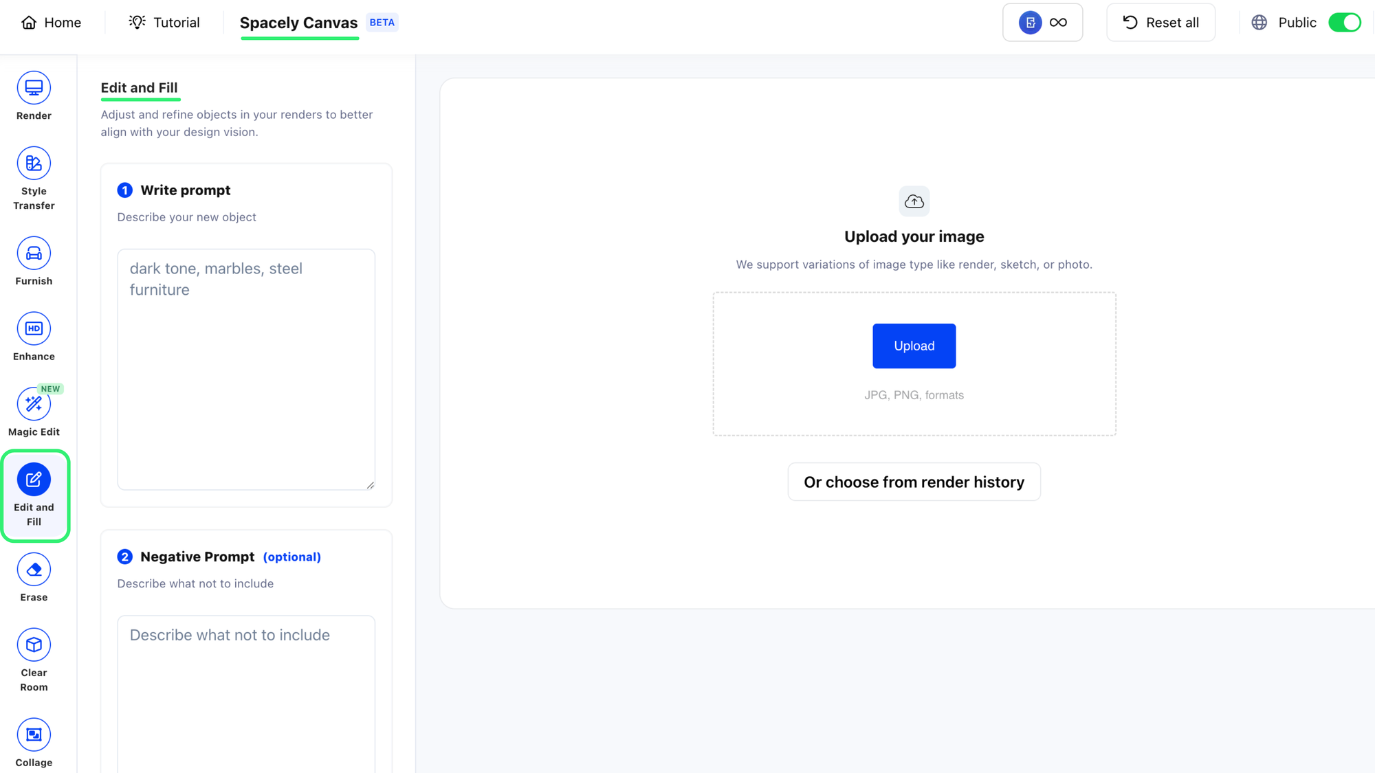 You can open the Edit and Fill Object tool from the tools page on our website or directly from the Spacely AI Canvas interface. Both options will lead you to the same feature set.