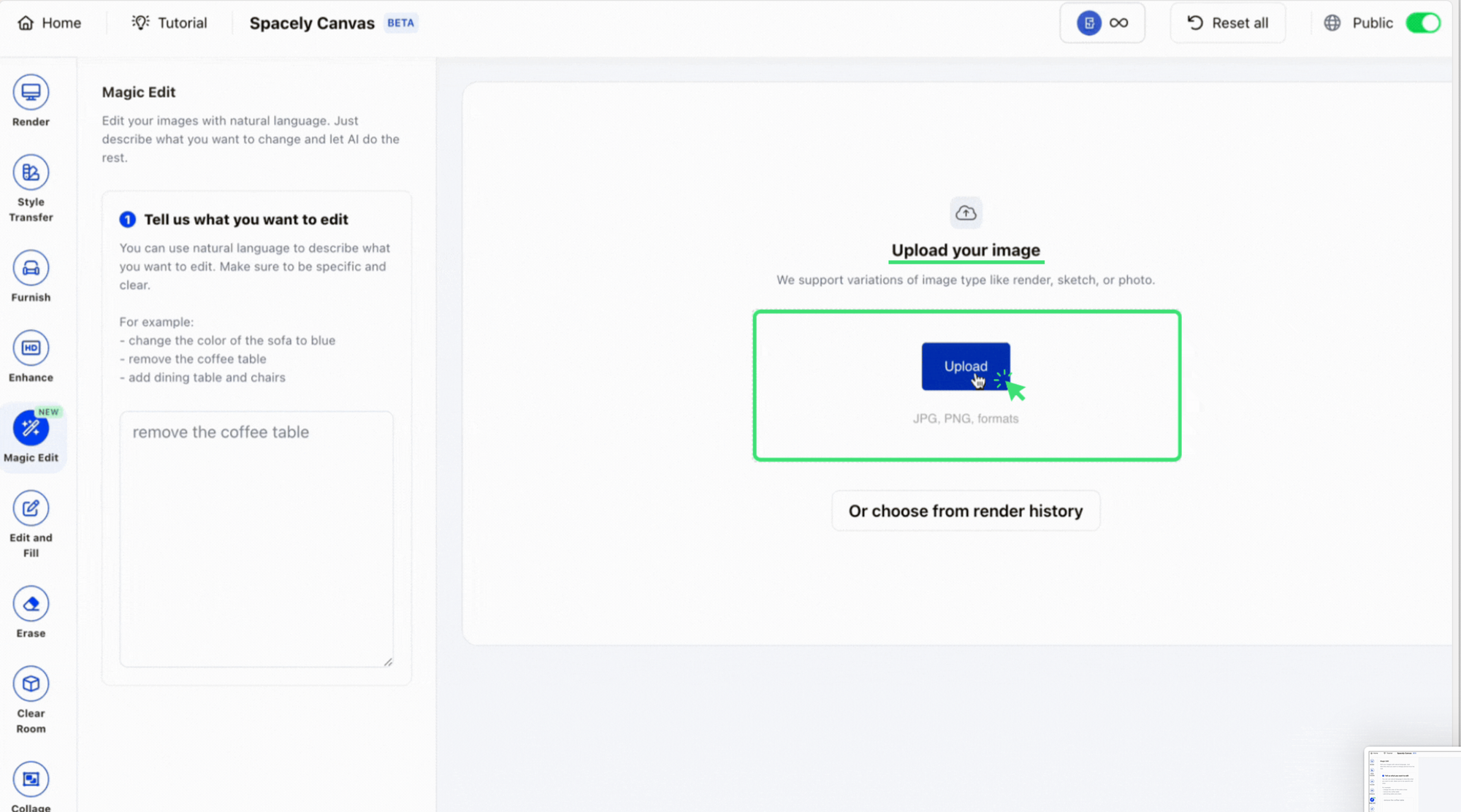 Spacely AI is thrilled to unveil our latest innovation, Magic Edit, a tool designed to revolutionize the way you approach image editing. With Magic Edit, you can now effortlessly design images through simple text commands, transforming your designs with unprecedented ease and speed.