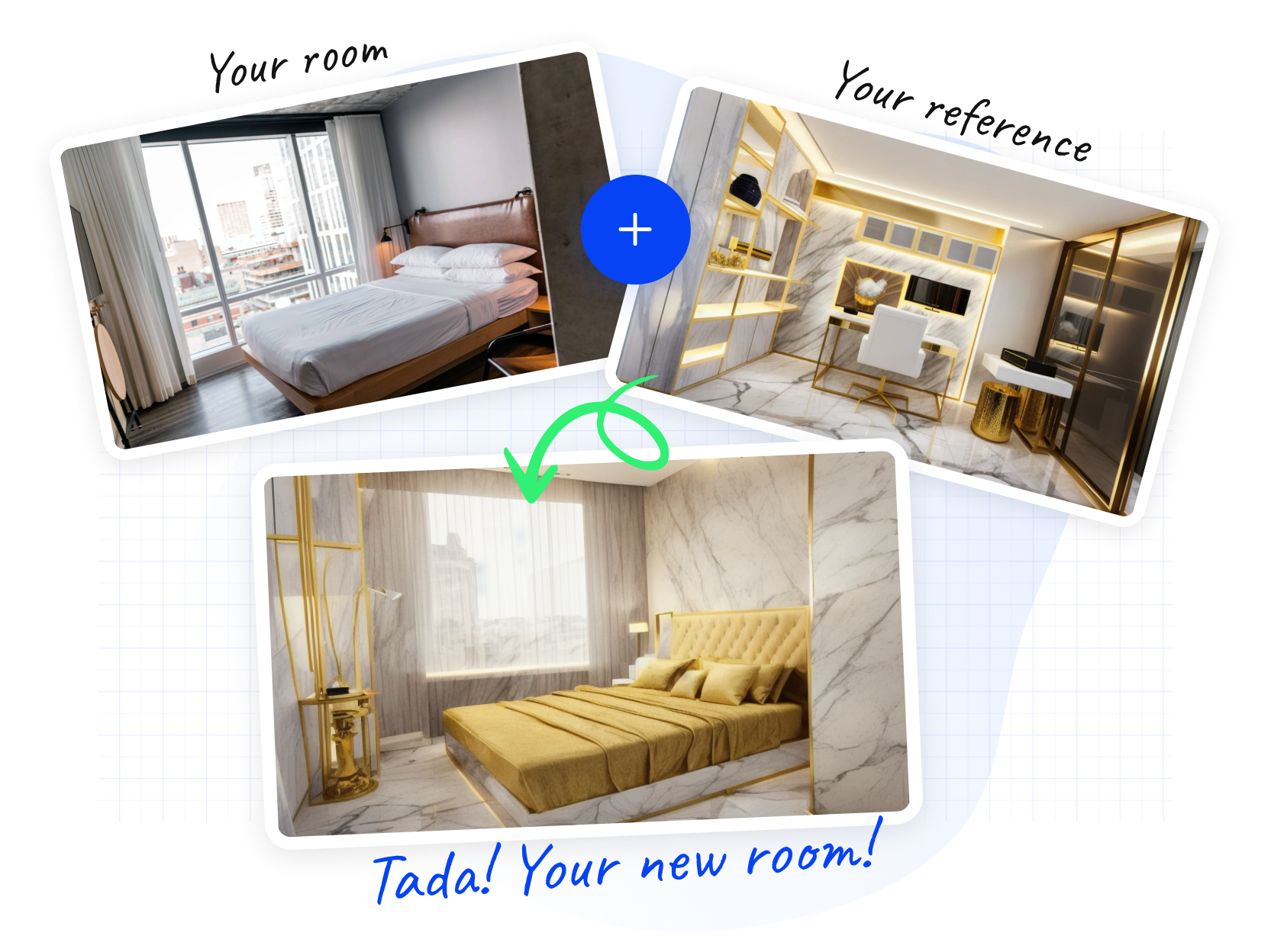 Style Transfer is a tool that lets you take the style of one image—called a reference image—and apply it to another image you upload as your design. This lets designers easily try out different looks for their spaces.