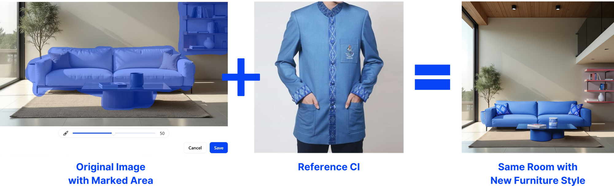 Upload an image of a commercial space and use masking to focus on specific areas like furniture or decor. Apply a new style that aligns with your brand identity.