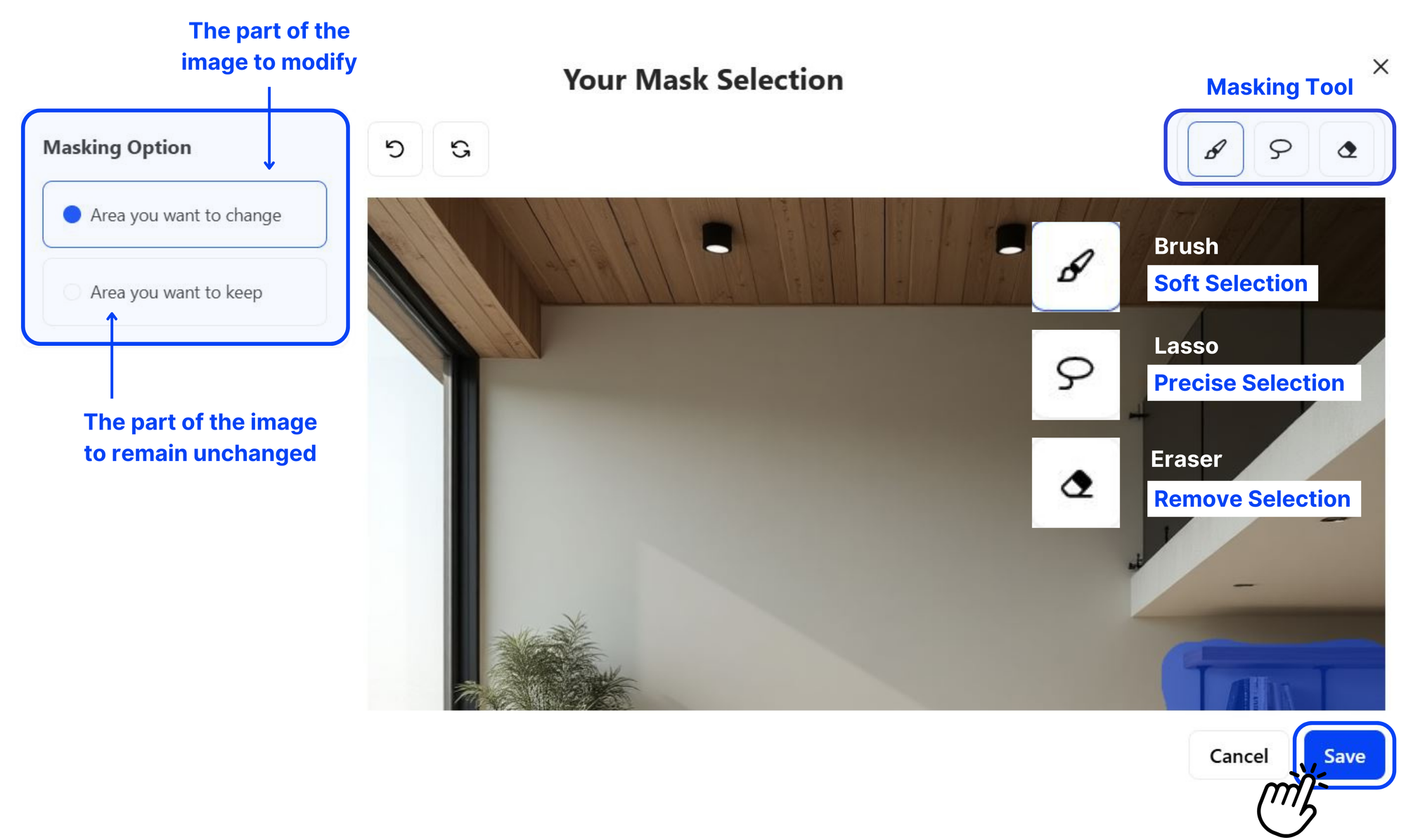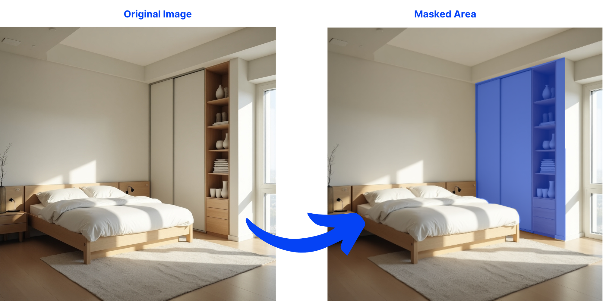 Masking is a tool that lets you select certain parts of an image to change while keeping other parts the same. This is helpful in interior design when you want to update furniture or decor without changing the whole room.
