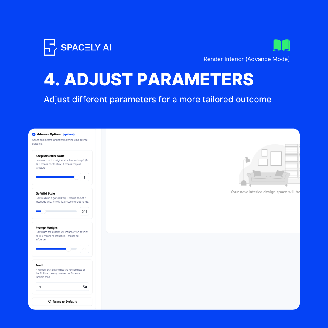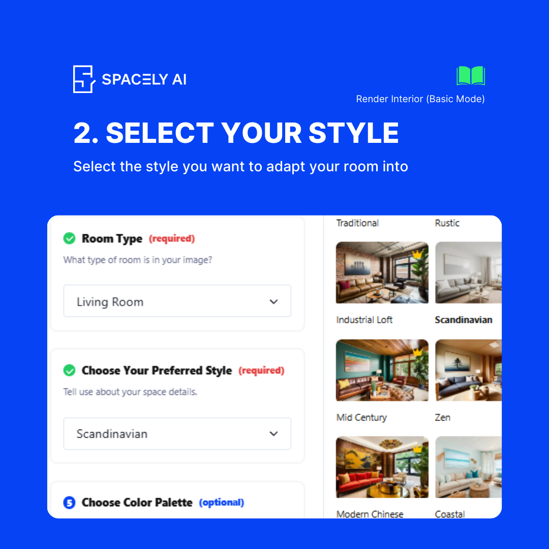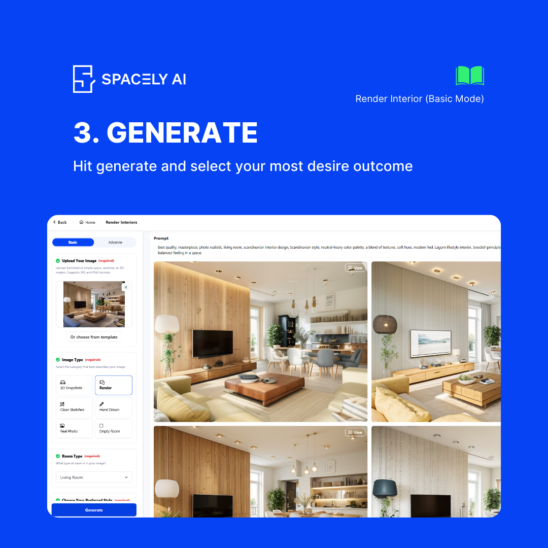Spacely’s Render Interiors feature is designed to give you unparalleled control and creativity in redesigning your spaces. Whether you prefer the simplicity of Basic Mode or the detailed customization of Advanced Mode, Spacely has you covered. Try it out today and transform your living space into something truly spectacular!