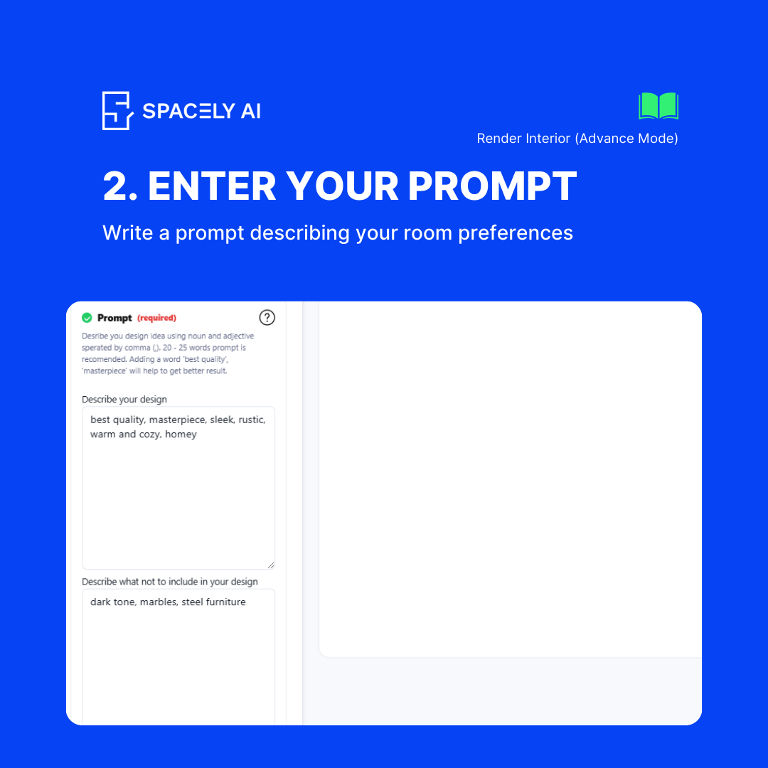 Positive Prompts: Specify elements you want to include in the new style (e.g., “wooden furniture,” “open shelves”). Negative Prompts: Specify elements you want to exclude (e.g., “no bright colors,” “no metal fixtures”).