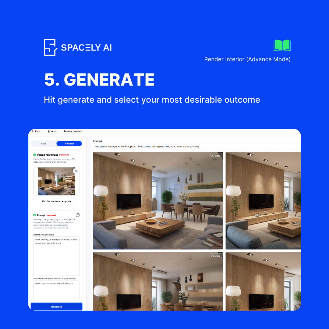 Click the Generate button. With the advanced settings, Spacely will take a bit longer to process, but the results will be worth the wait. Enjoy a uniquely customized room transformation that aligns perfectly with your vision.