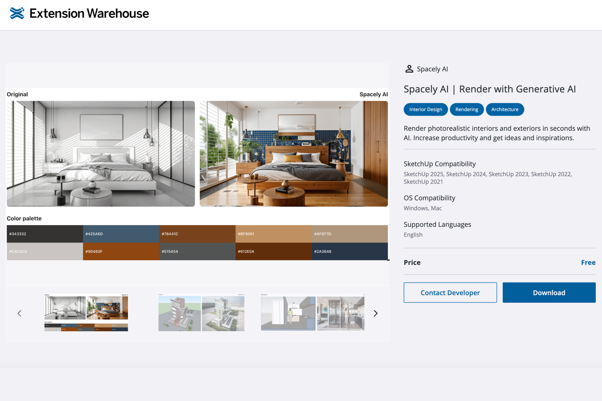 - Access: Full feature set with unlimited renders on Spacely AI website and SketchUp