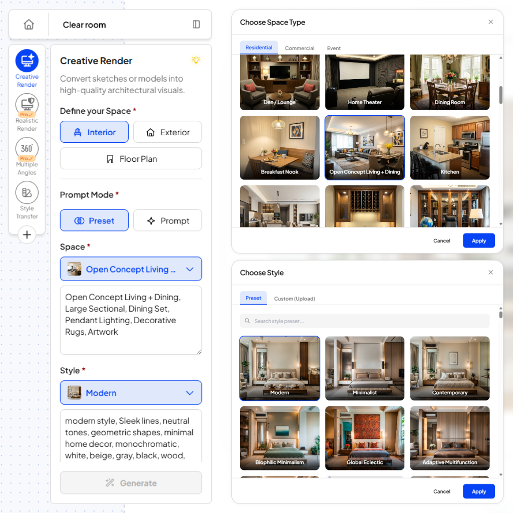 Scale your marketing, not your expenses. Our AI tools for real estate allow you to deliver photorealistic renders that buyers love and your budget appreciates.