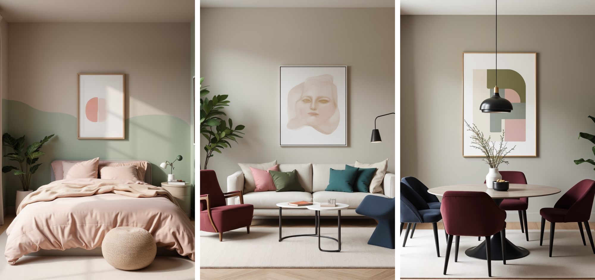 "Photorealistic dining room, soft taupe walls, gentle green and blush accent decor, bold colored dining chairs in deep burgundy or navy, minimalist dining table, modern pendant light in brass or black, subtle textures, calm yet expressive color balance, intimate and stylish space"