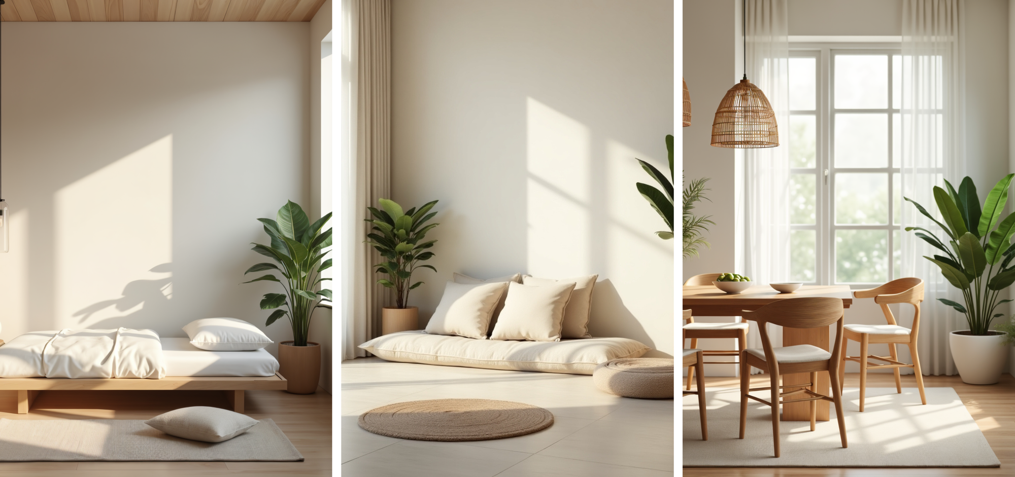 "High quality render, wellness living room, light natural tones, low seating for meditation, organic textiles, indoor plants, floor cushions, soft lighting, aromatherapy diffuser, clean and airy layout, calming décor, space designed for relaxation and mindfulness"