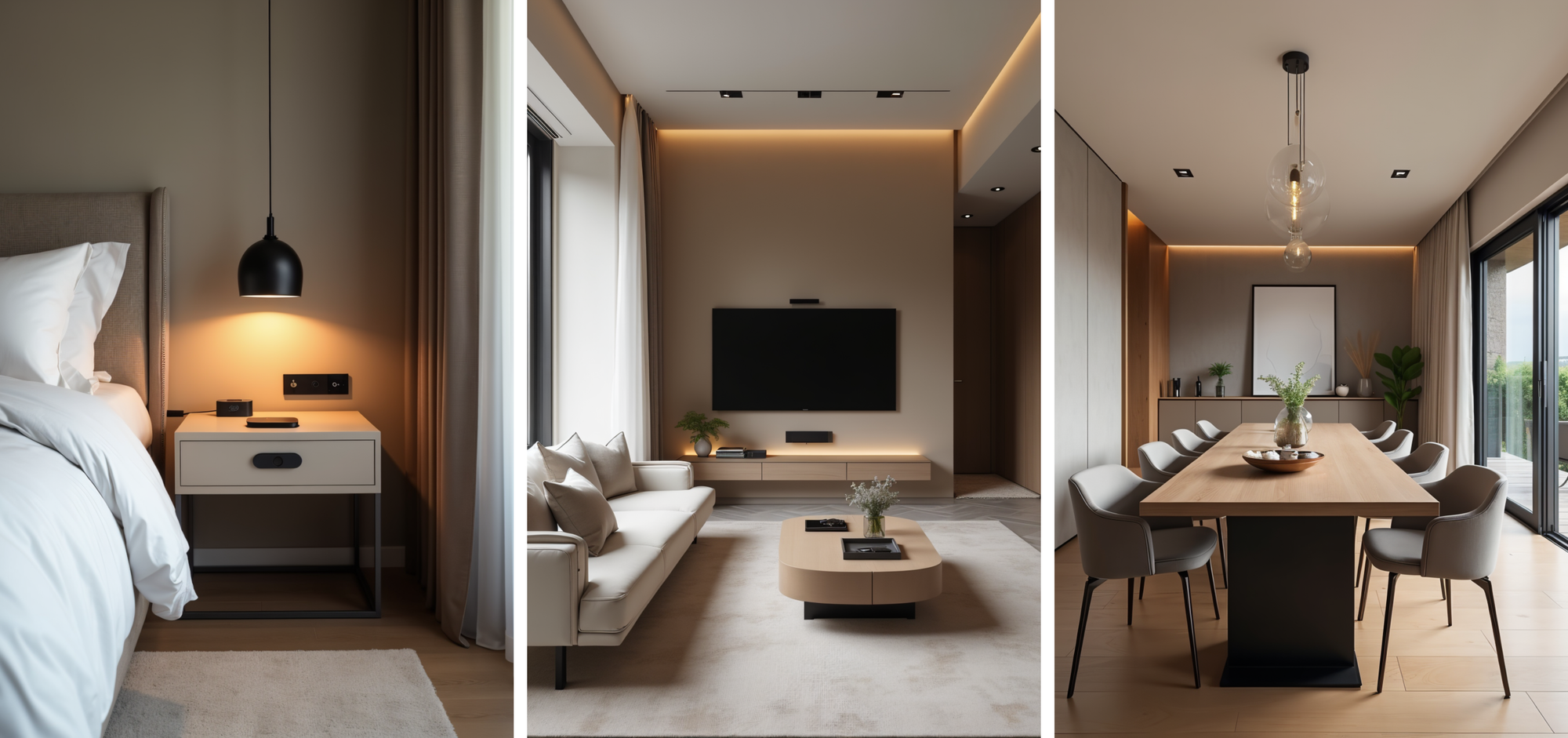 "Modern dining room, minimalist design, integrated smart tech features, voice-controlled lighting, wireless charging dining console, hidden sound system, neutral color palette, sleek furniture with clean lines, seamless and functional layout, tech-enhanced but unobtrusive style"