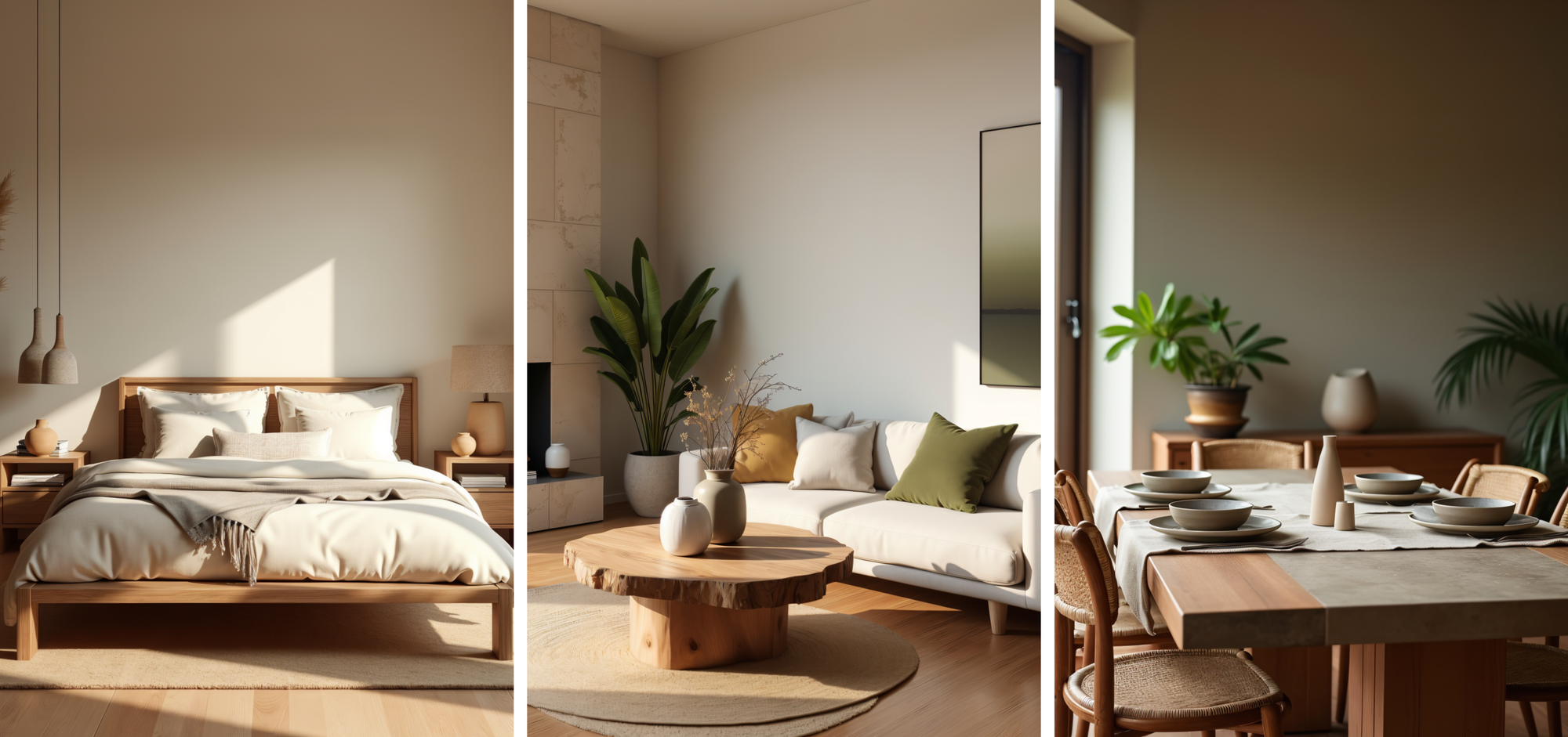 Nature continues to shape interiors. Think rustic woods, stone textures, ceramic accents, and soft earthy tones like sand and olive. These grounded spaces feel calm and timeless—perfect for everyday living.