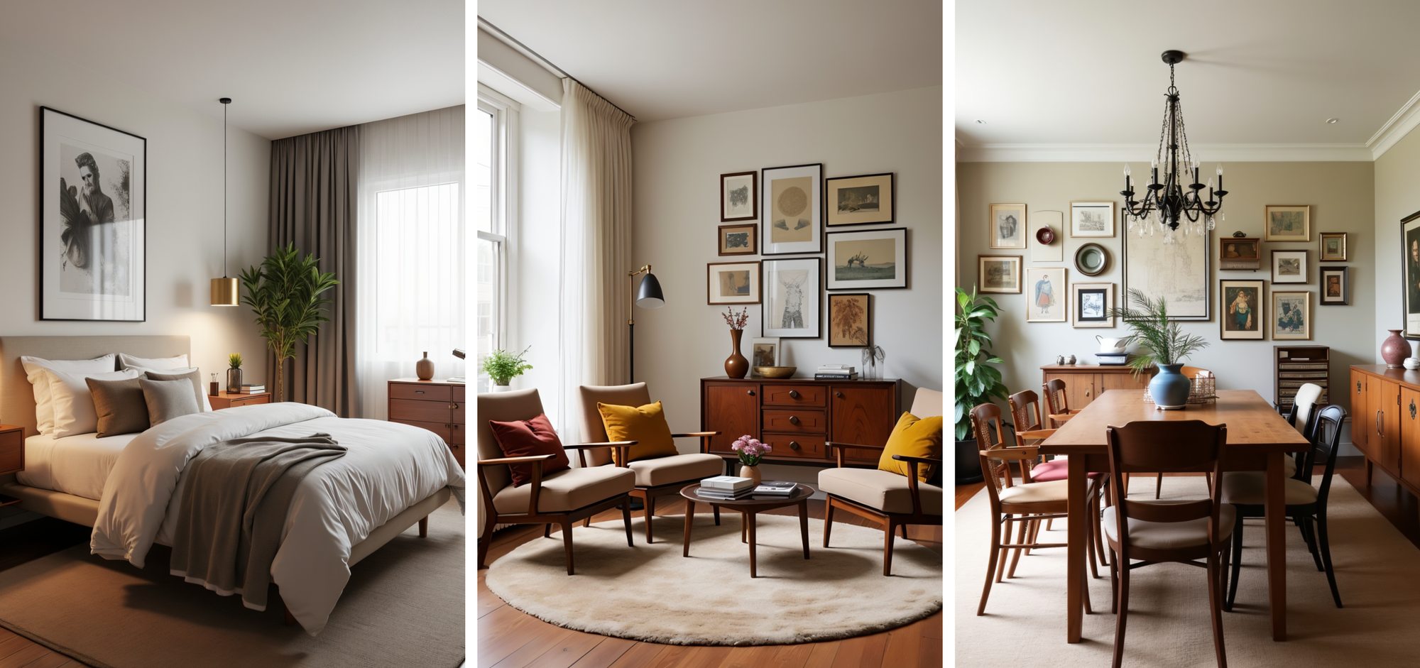 "Photorealistic image, eclectic living room, vintage-modern fusion, mid-century armchairs, antique credenza, curated decor pieces, gallery wall of mixed frames, velvet cushions, brass floor lamp, neutral base with character accents, layered textures, warm and inviting space"
