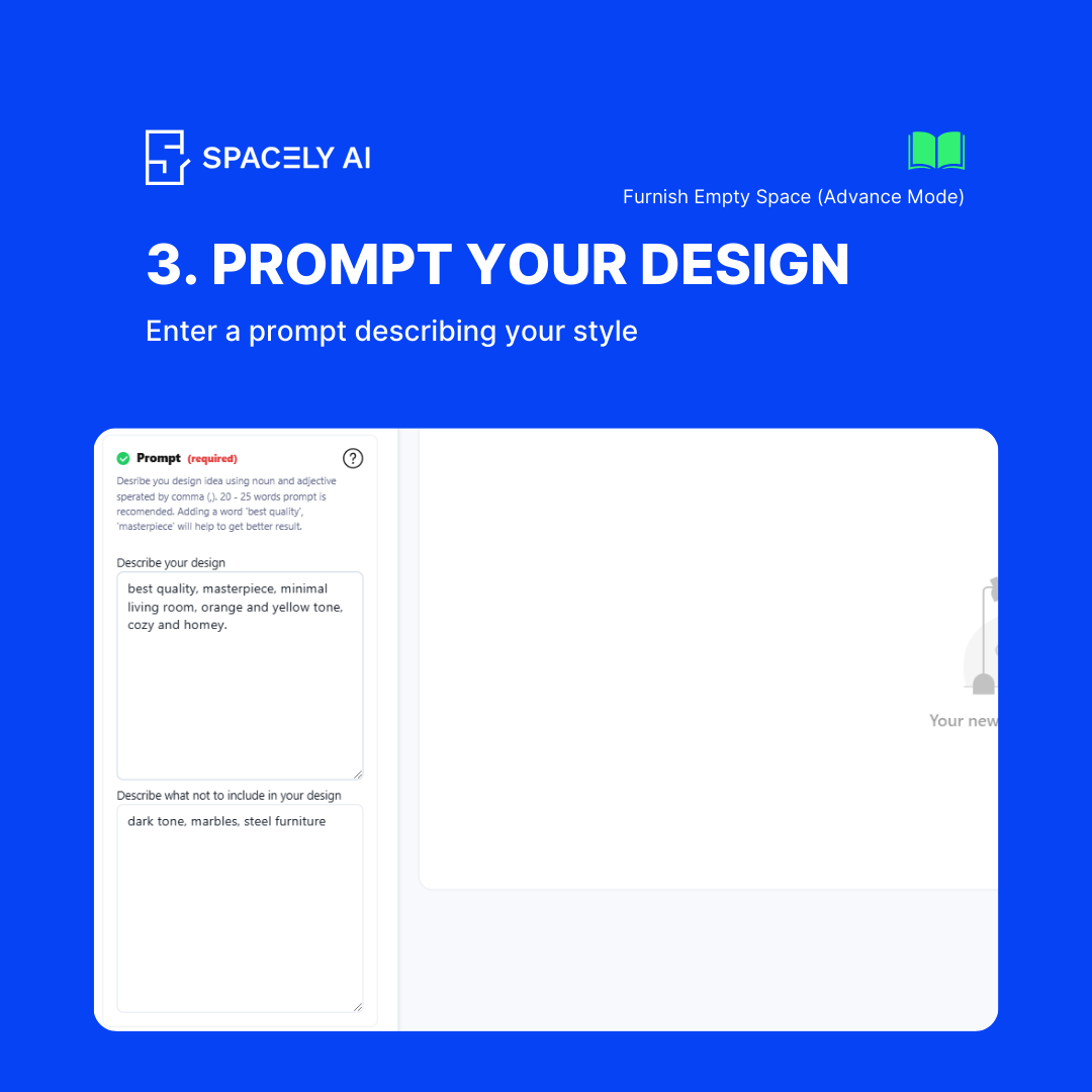 Positive Prompts: Specify elements you want to include in the furnishing (e.g., “wooden furniture,” “cozy rugs”). Negative Prompts: Specify elements you want to exclude (e.g., “no bright colors,” “no metal fixtures”).