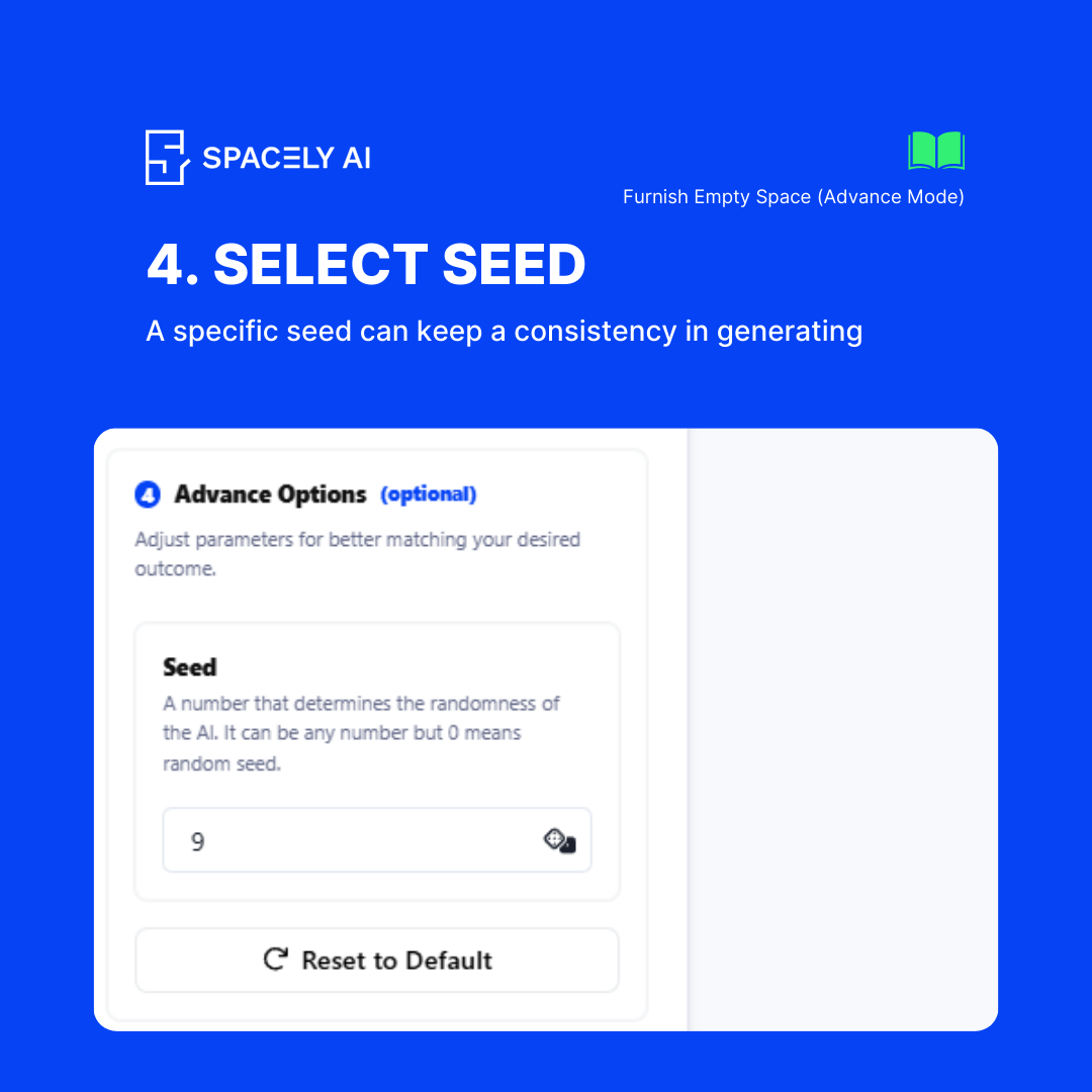 For more detailed customization, switch to Advanced Mode. Add positive prompts like “modern sofa,” “sleek coffee table,” and “abstract wall art.” Use negative prompts to exclude “traditional elements” and “dark colors.” Select a seed to ensure the results align with your vision, and generate. The result will be a modern living room tailored to your specific tastes and requirements.