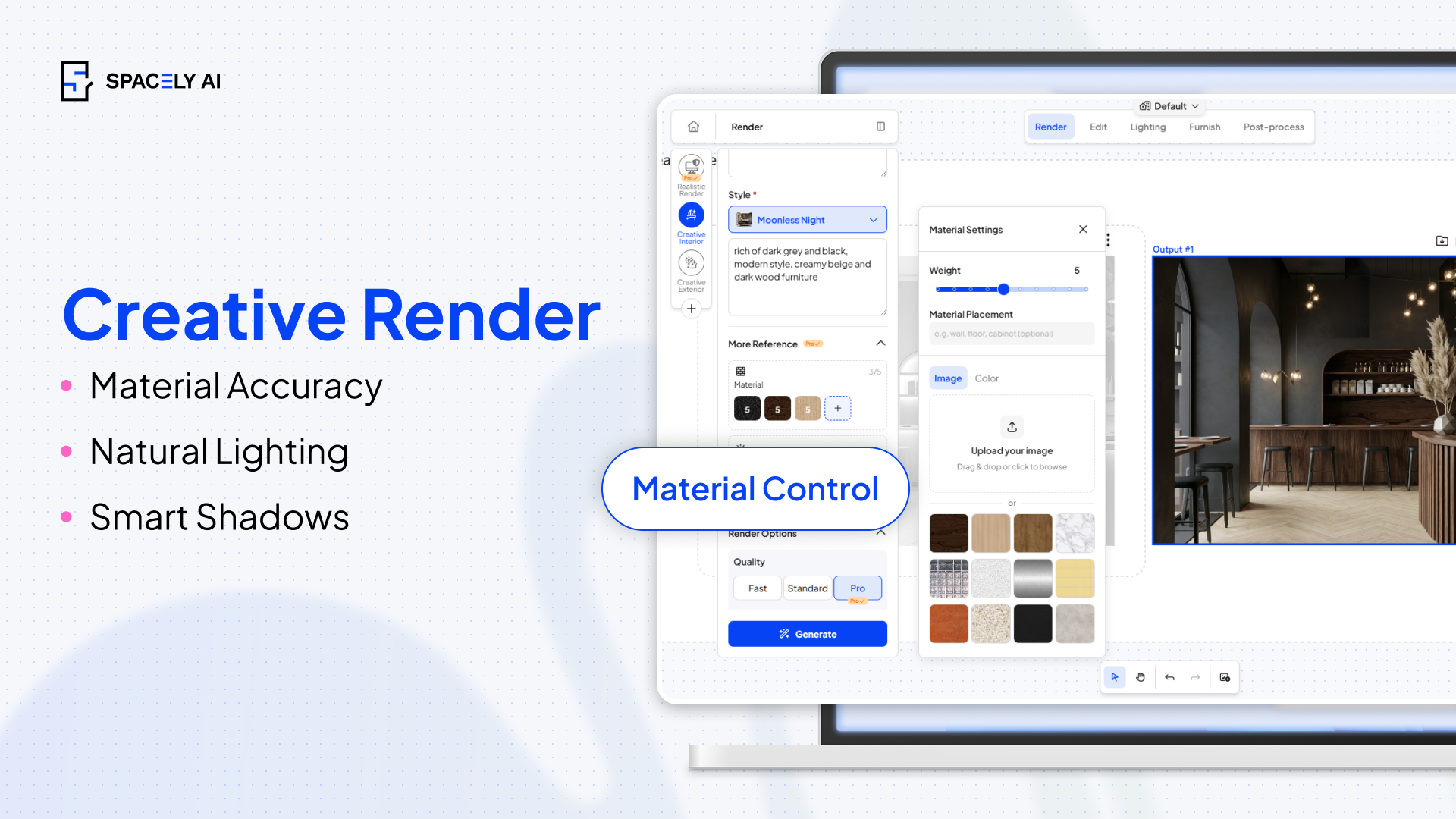 Lighting is one of the most defining elements in any spatial design — and one of the hardest to communicate before a project is built. This quarter, Spacely AI introduces two new lighting tools that give you direct control over how a space feels, not just how it looks.
