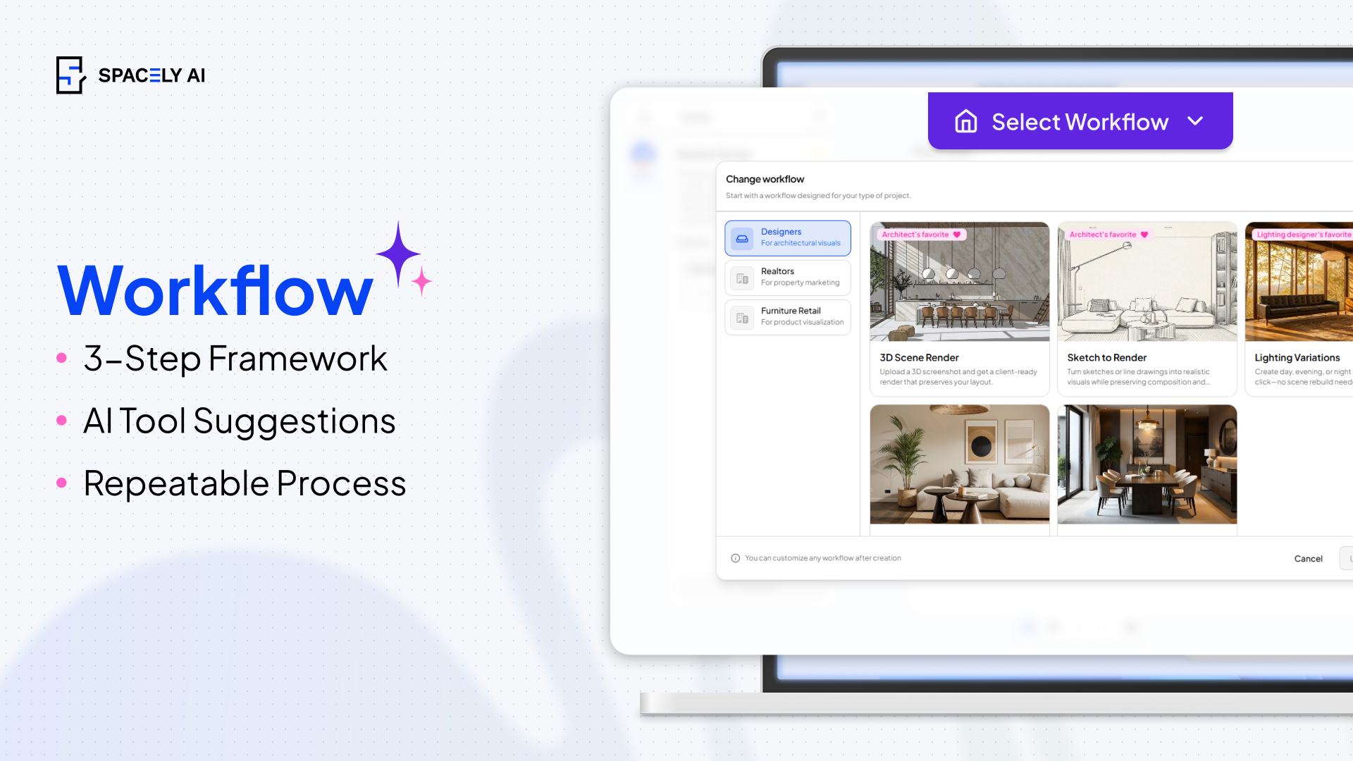 If you're new to AI rendering, Workflow eliminates the "where do I start?" You pick a template — Interior Redesign, Virtual Staging, Sketch to Render — and the workflow guides you through each step. If you're an experienced Spacely AI user, Workflow makes your design process a sequence repeatable across your projects.