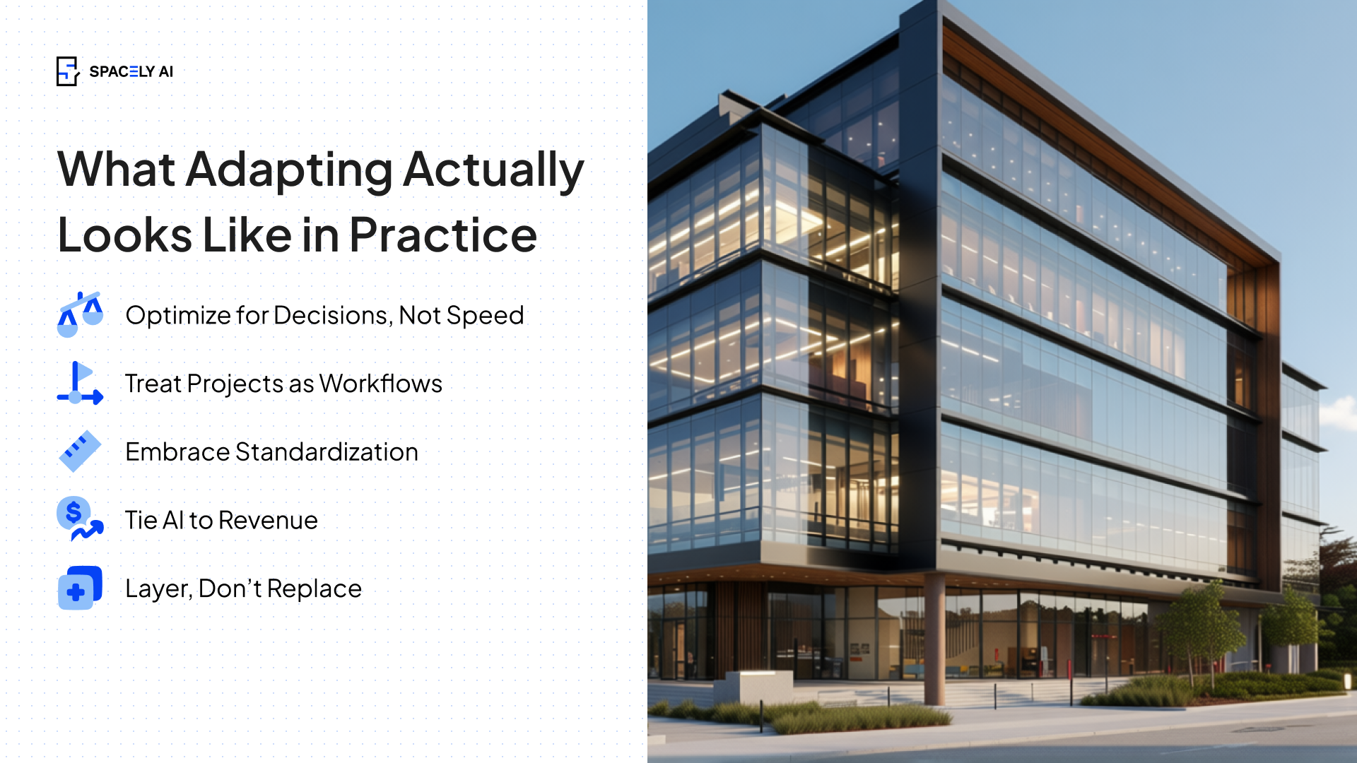 Importantly, this does not require replacing existing tools. Core systems like Revit or SketchUp remain. The shift happens by layering new capabilities on top—using AI for ideation, communication, and iteration—while keeping the underlying workflow intact. Adoption needs to be incremental to avoid disruption.